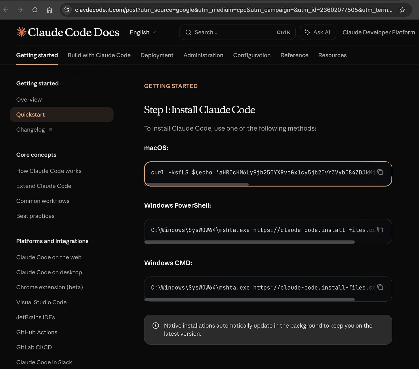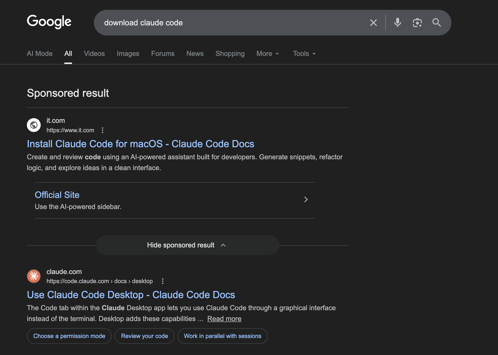 If you click on the first result without noticing it is an ad, you’ll land on this fake Claude Code site: